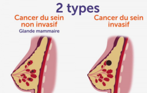 Le premier type le plus fréquent est le cancer non invasif, plus facile à diagnostiquer grâce à une large utilisation de la mammographie. C’est un cancer qui ne se dissémine pas dans tout le corps, mais sans traitement, il peut continuer à se développer et se répandre autour des canaux de lactation. Le deuxième type de cancer du sein, ce sont les cancers invasifs qui, eux aussi, sans traitement, se disséminent un peu partout et engendrent des métastases. On peut citer le carcinome inflammatoire, rare et dont les symptômes consistent en un sein enflé, très brûlant et de couleur rougeâtre. Puis, le carcinome lobulaire ou des cellules cancéreuses qui apparaissent dans les lobules et en traversent la paroi pour envahir les tissus environnants. Le carcinome canalaire, lui, commencent à se former dans les canaux de lactation et finissent par traverser leur paroi et enfin, les autres carcinomes, plus rares tels que papillaires, médullaires etc. et enfin la maladie de Paget qui se traduit par une plaie sur le mamelon.